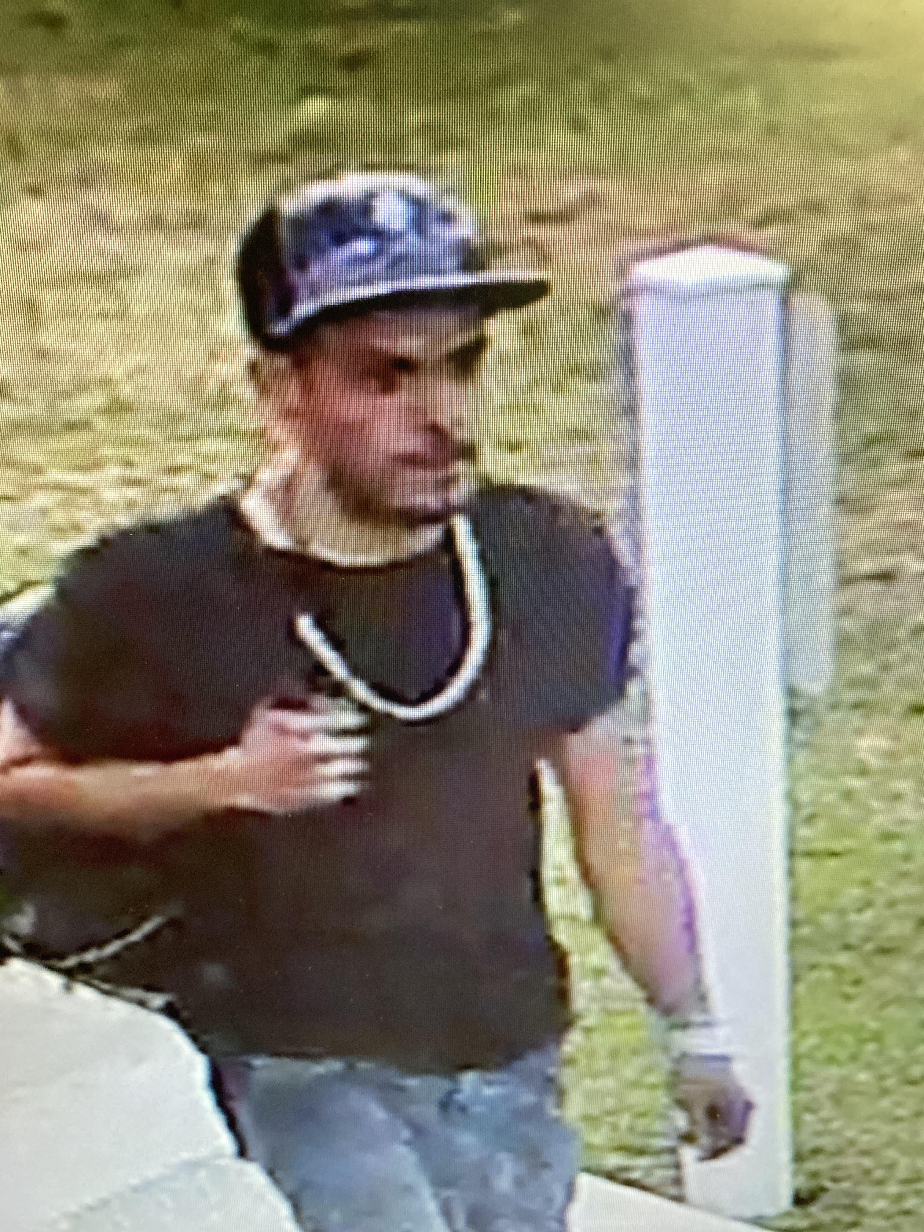 As you can see in the image, the suspect is a white male and was wearing a black and light gray ball cap, long blue-jean shorts, and a black t-shirt. He was also carrying a black backpack and is known to ride a red three-wheeled bicycle.